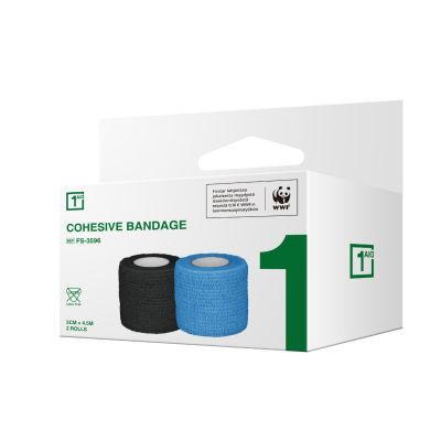 Förpackningen innehåller två rullar självhäftande tejp, till exempel för att fästa sårförband på människor eller djur.