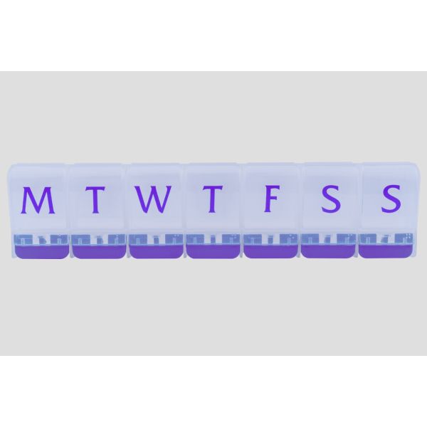 Ominaisuudet: • 7 lokeroa, yksi jokaiselle viikonpäivälle • Kompakti ja kevyt muotoilu • Selkeät kirjainmerkinnät kannessa • Helppokäyttöinen ja hygieeninen • Sopii koti- ja matkakäyttöön