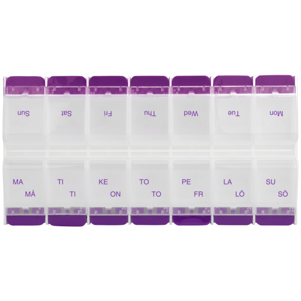 Ominaisuudet: • 14 lokeroa, kaksi jokaiselle viikonpäivälle • Kompakti ja kevyt muotoilu • Selkeät kirjainmerkinnät kannessa • Helppokäyttöinen ja hygieeninen • Sopii koti- ja matkakäyttöön