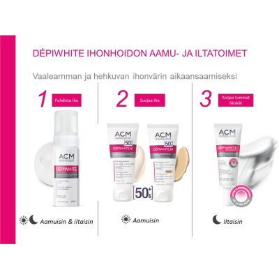 Annostele ACM Depiwhite.M -voidetta ihollesi säännöllisesti aamuisin. Jos olet pidempään auringonvalossa, levitä voidetta iholle runsaasti ennen auringonvalolle altistumista. Lisää voidetta erityisesti hikoilun, uinnin tai ihon pyyhkimisen jälkeen.
