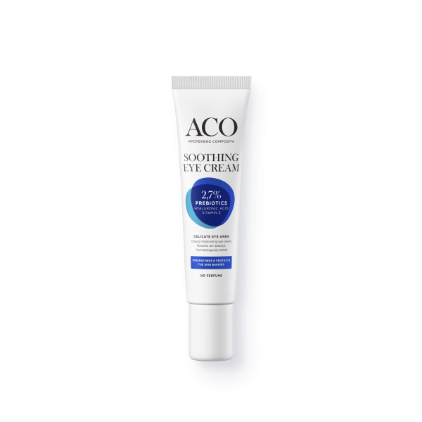 ACO Soothing Eye Cream on erityisesti herkälle silmänympärysiholle kehitetty hellävarainen voide, joka kosteuttaa ja rauhoittaa ihoa välittömästi. Voide sopii käytettäväksi myös liikkuvalla luomella, tarjoten kliinisesti todistetun vaikutuksen. Se sisältää hyaluronihappoa, joka syväkosteuttaa ihoa ja tekee siitä kimmoisamman, sekä ravitsevaa E-vitamiinia, joka suojaa ihoa ulkoisilta ärsykkeiltä.