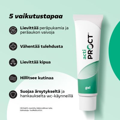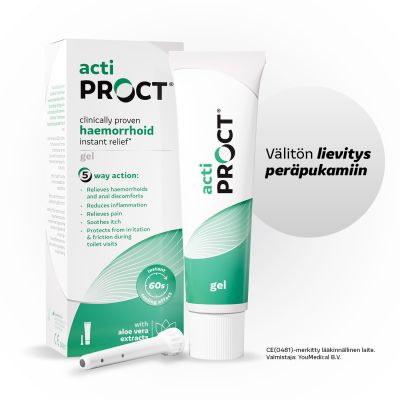 ActiProct®-geelillä on kliinisesti todistettu peräpukamavaivoja lievittävä vaikutus. Geelin on osoitettu vähentävän tehokkaasti kutinaa, ärsytystä, kipua, tulehdusta ja kirvelyä.