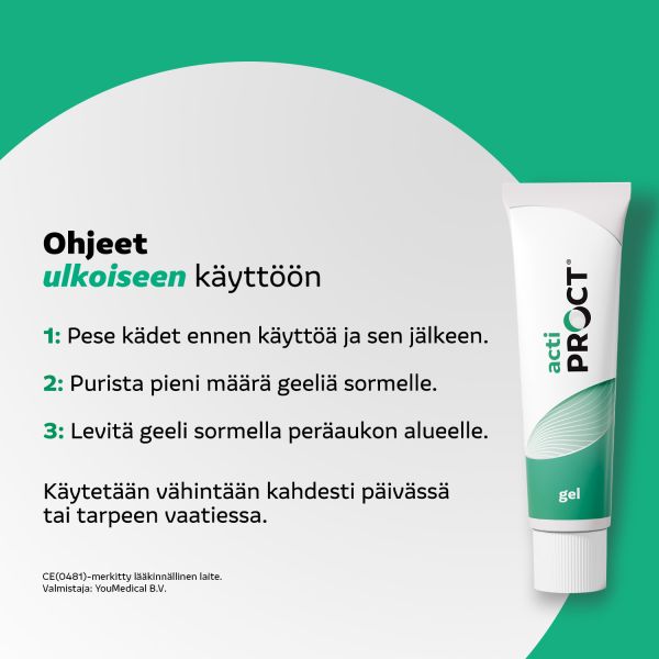 Peset kädet ennen tuotteen käyttöä ja käytön jälkeen. Annostele pieni määrä ActiProct®-geeliä sormelle ja levitä peräaukon ympäristöön. Sulje tuubi tiukasti käytön jälkeen, jotta geeli ei kuivu.