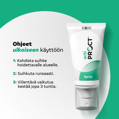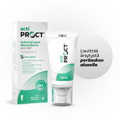 ActiProct Spray on rauhoittava suihke, joka lievittää ärsytystä peräaukon alueella ulkoisesti käytettynä. Tuotetta suihkutetaan peräaukolle, jossa viilentävä vaikutus alkaa heti ja kestää jopa kolmen tunnin ajan. Suihke rauhoittaa häiritsevää kutinaa peräaukolla, suojaa ja kosteuttaa ihoa sekä tukee ihon luontaista palautumista.