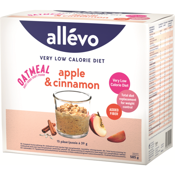 Allévo Very Low Calorie Diet (VLCD) on täysipainoinen ja erittäin vähäkalorinen ateriankorvike painonhallintaan. Se sopii täydellisesti nopeaan aloitukseen matkalla uuteen, kevyempään elämään. Viidestä annoksesta päivässä Allévo VLCD -tuotteita saat kaikki vitamiinit, kivennäisaineet ja ravintoaineet, mutta energiaa vain noin 750 kcal / vrk. Omenaa ja kanelia sisältävä puuro. Sisältää muun muassa myös auringonkukansiemeniä ja pellavansiemeniä. Noin 150 kcal/annos.