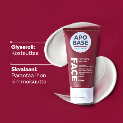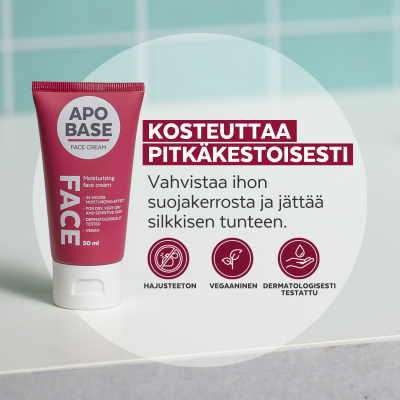 Apobase Face Cream on kasvovoide, joka kosteuttaa pitkäkestoisesti (24 h) ja auttaa palauttamaan ja vahvistamaan ihon luonnollista suojakerrosta. Voide sopii kuivalle, erittäin kuivalle, herkälle ja atooppiselle iholle. Se ehkäisee ihon kuivumista ja sopii päivittäiseen käyttöön. Hajusteeton ja vegaaninen. Dermatologisesti testattu.