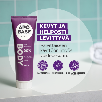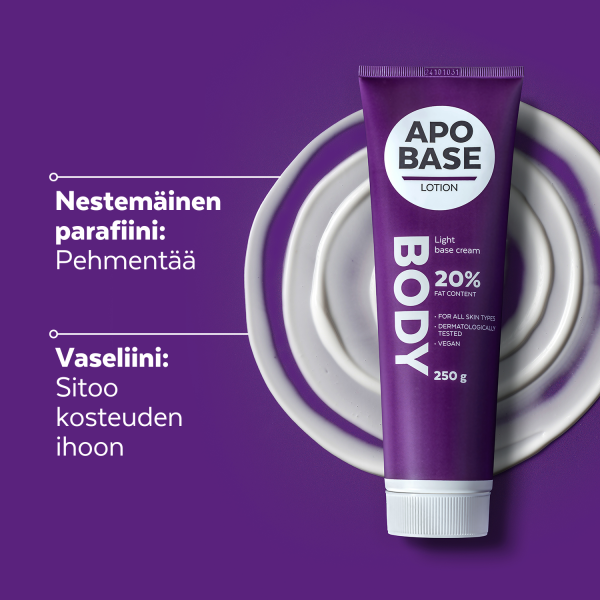 Apobase Lotion on helposti imeytyvä, kosteuttava ja kosteuden sälilyttävä perusvoide koko kehon päivittäisee hoitoon. Kaikille ihotyypeille sopiva perusvoide on jajusteeton ja lisäaineeton voide sopii koko perheelle. Myös meikin alla käytettävä tuote toimii myös kuivan ihon pesuaineena sekä kuivan, hilseilevän hiuspohjan hoidossa.