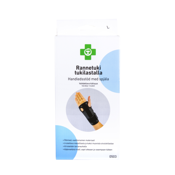Vakaan ja voimakkaan tuen antava rannetuki, jossa irrotettava metallilasta ja kaksi muovista sivutukilastaa. Käännettävä malli, sopii oikeaan ja vasempaan ranteeseen.
