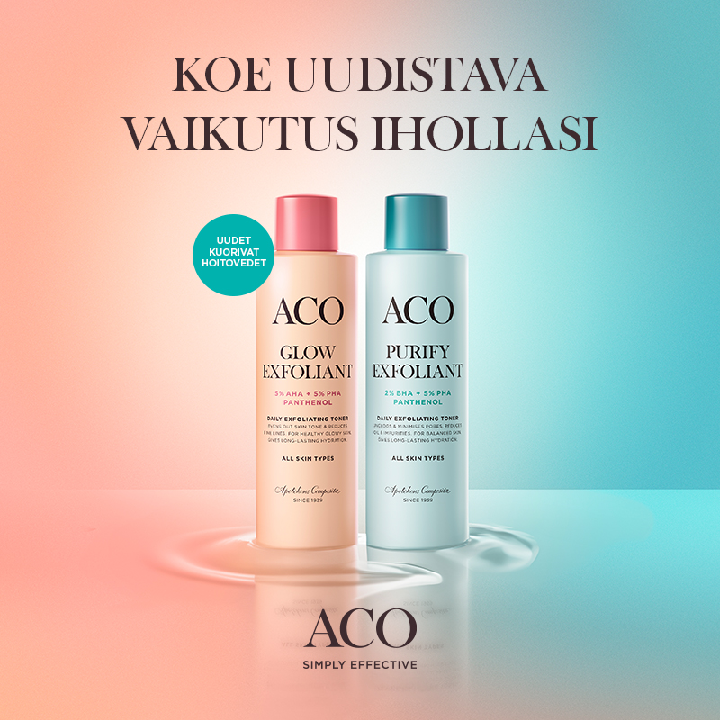 ACO on pohjoismainen apteekkikosmetiikkabrändi, joka yhdistää kliinisesti testatut koostumukset ja hellävaraisuuden. Sarjan tuotteet on kehitetty erityisesti kuivan, herkän ja kosteusköyhän ihon hoitoon pohjoismaisissa sääolosuhteissa. Valikoimassa on tuotteita kasvoille, vartalolle ja hygieniaan sekä auringolta suojaamiseen. Aco tarjoaa kasvovoiteita, seerumeita, puhdistustuotteita, vartalovoiteita ja huulivoiteita, jotka kosteuttavat ja suojaavat ihoa tehokkaasti.