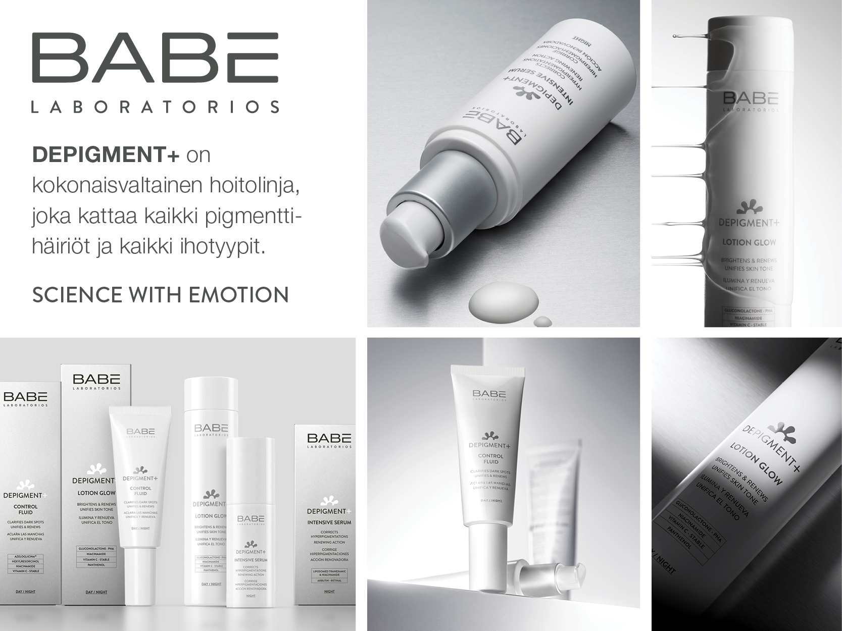 BABÉn teknologisesti edistynein tuotesarja. Kokonaisvaltainen ratkaisu, joka kattaa kaikki pigmenttihäiriöt, kaikki ihotyypit, kaikki fototyypit, kaikki vuodenajat sekä kaikki ikäryhmät ja sukupuolet. Tuotteet ovat helposti integroitavissa muihin hoitorutiineihin ja ne voidaan yhdistää keskenään. Sarja koostuu kolmesta tuotteesta, jotka ehkäisevät, tasoittavat, kirkastavat ja hoitavat näkyviä tummia läiskiä, mutta myös niitä, jotka ovat piilossa ihon pinnan alla. Tuotekehitystiimimme on luonut kevyet, hienostuneet ja sulavat koostumukset, jotka tarjoavat aistillisen ja miellyttävän käyttökokemuksen.