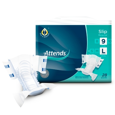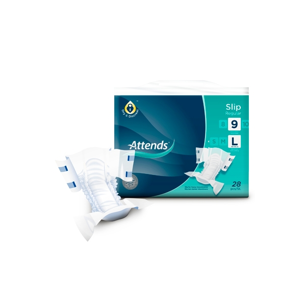 Teippivaippa Attends Slip Regular L. Lievästä erittäin vaikeaan inkontinenssiin. Quick Dry- imujärjestelmä ja Odour Protection hajunpoistojärjestelmä tuovat miellyttävän tunteen iholle. 4-teipin kiinnitys.