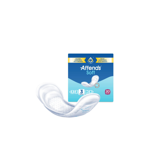Attends Soft 3 Extra on erittäin ohut, huomaamaton ja anatomisesti muotoiltu inkontinenssisuoja lievään virtsankarkailuun. Silkinpehmeä, sinisillä kukilla koristeltu pintakerros on erityisesti kehitetty herkälle iholle. Suoja sopii naisille, jotka kaipaavat pientä lisäsuojaa päivän aikana.