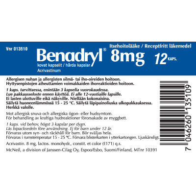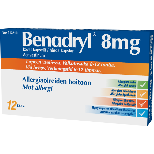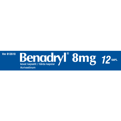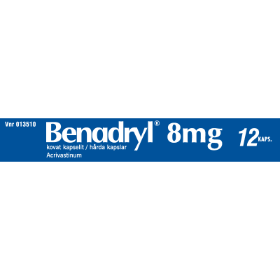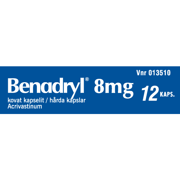 Benadrylin vaikuttava aine on akrivastiini, joka on erittäin nopeavaikutteinen allergialääke eli antihistamiini.
