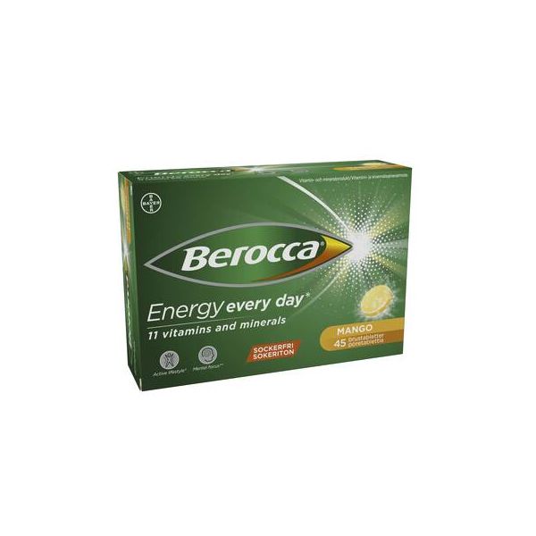 Välsmakande brustabletten med mangosmak innehåller 11 viktiga vitaminer och mineraler. Berocca Energy Mango brustabletter innehåller B-vitaminer och C-vitamin samt zink och magnesium. Vitamin B2, B3, B5, B12 och C samt magnesium som finns i brustabletter löses snabbt upp i vatten och hjälper till att minska trötthet och utmattning. Vitamin B5 bidrar till normal mental prestationsförmåga. Vitaminer B6, B9 och C samt zink bidrar till immunsystemets normala funktion. Vitamin B1, B2, B3, B5, B6, B7, B12 och C och magnesium bidrar till normal energiomsättning. Lös upp en tablett i ett glas vatten och njut av en utsökt drink. Lämplig för veganer. Innehåller inte koffein. Sockerfri.