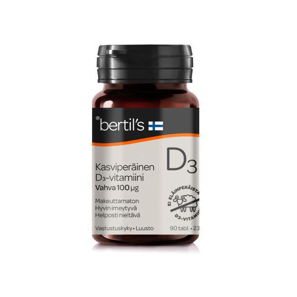Kasviperäinen bertil’s D3-vitamiini on vaihtoehto eläinperäisille D3-vitamiinivalmisteille. Levästä eristetty D3-vitamiini on rakenteeltaan identtistä, samaa hyvin imeytyvää kolekalsiferolia kuin perinteinen lammasperäinen D3-vitamiini.