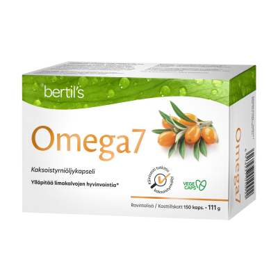 Terveet limakalvot ja iho ovat monin tavoin olennaiset elimistön hyvinvoinnin kannalta. Korkealaatuiset bertil´s Omega7 Kaksoistyrniöljykapselit tukevat limakalvojen ja ihon hyvinvointia sisältämiensä rasvahappojen, kasvisteroleiden ja antioksidanttien avulla. Tuotteen sisältämä kliinisesti tutkittu kaksoistyrniöljy tarjoaa täyden hyödyn tyrnimarjan poikkeuksellisista ravitsemuksellisista ominaisuuksista, sillä se sisältää molemmat tyrnimarjan sisältämät öljyt - sekä tyrnimarjan hedelmälihan että siementen öljyn.