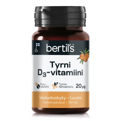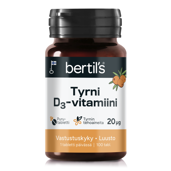 Suomessa kehitetty ja valmistettu raikkaanmakuinen bertil's tyrni-D3-vitamiinipurutabletti. Sisältää hyvin imeytyvän D3-vitamiinin lisäksi kliinisesti tutkittua erittäin korkean antioksidanttipitoisuuden omaavaa uuden sukupolven CyanthOx™-tyrnibioflavonoidiuutetta ja tyrninmarjajauhetta.