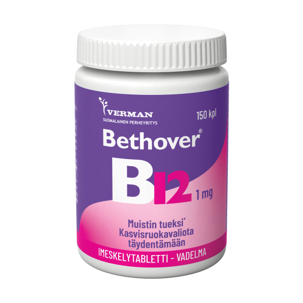 B12-vitamiini imeskelytablettina muistin ja jaksamisen tueksi. B12-vitamiini on tärkeä vitamiinilisä mm. ikääntyville ja kasvissyöjille. Ei sisällä eläinperäisiä ainesosia, sopii vegaaneille. Tuote on laktoositon, maidoton gluteiiniton ja sokeriton.