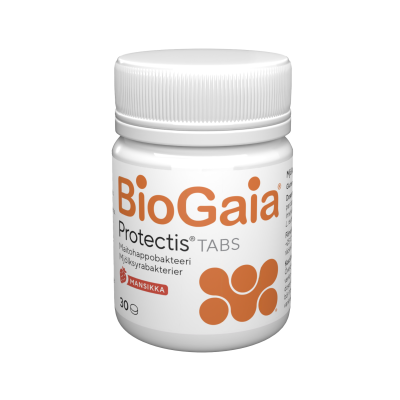BioGaia Tabs on maitohappobakteerivalmiste, joka sisältää tutkittua ja patentoitua Lactobacillus reuteri Protectis® (L. reuteri DSM 17938) -maitohappobakteerikantaa, josta on tehty yli 200 kliinistä tutkimusta. Mansikanmakuiset purutabletit sopivat kaikenikäisille joko päivittäiseen käyttöön tai kuurina. Annostus on 1 purutabletti päivässä. Maidoton, gluteeniton, laktoositon. Ei sisällä eläinperäisiä aineita. Ravintolisä.