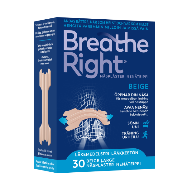 Breathe Right® -nenäteippi lievittää nenän tukkoisuutta välittömästi. Helpottaa välittömästi seuraavista syistä johtuvaa nenän tukkoisuutta: allergiat, vilustuminen, poikkeama nenän väliseinässä. Kohottaa nenän tiehyitä, jolloin jopa 31 %:a enemmän ilmavirtausta. Auttaa vähentämään kuorsausta. Aikuisille ja yli 5-vuotiaille lapsille.