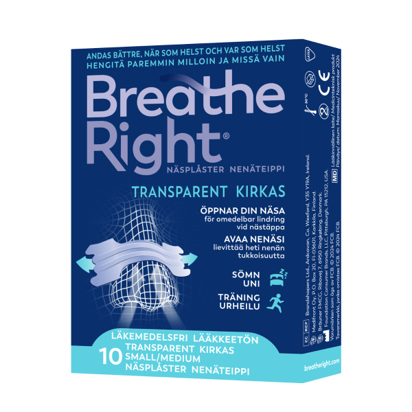 Breathe Right® -nenäteippi lievittää nenän tukkoisuutta välittömästi. Helpottaa välittömästi seuraavista syistä johtuvaa nenän tukkoisuutta: allergiat, vilustuminen, poikkeama nenän väliseinässä. Kohottaa nenän tiehyitä, jolloin jopa 31 %:a enemmän ilmavirtausta. Auttaa vähentämään kuorsausta. Aikuisille ja yli 5-vuotiaille lapsille.