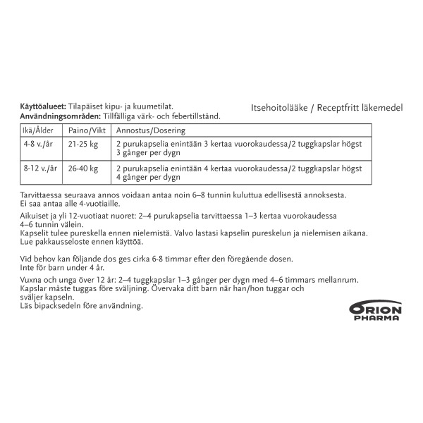 - 4-8 v. ikäiset, 21-25 kg painavat: 200 mg korkeintaan 3 kertaa vuorokaudessa
