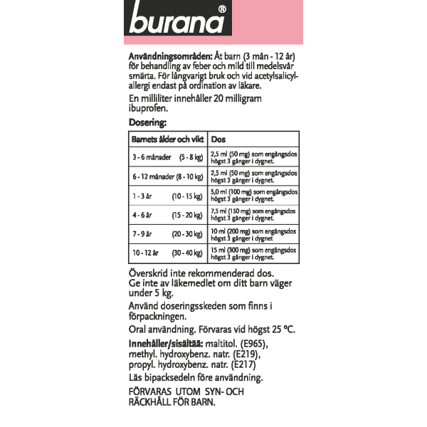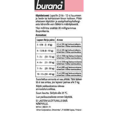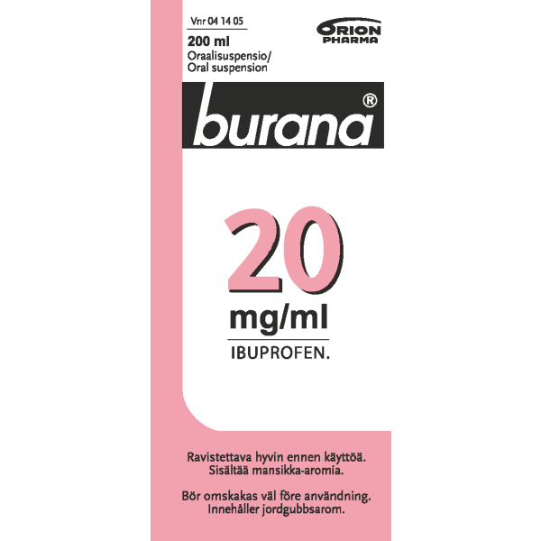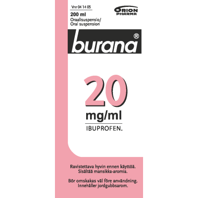 Burana 20 mg/ml oraalisuspensio sisältää vaikuttavana aineena ibuprofeenia. Ibuprofeeni kuuluu tulehduskipulääkkeiden lääkeryhmään. Burana-oraalisuspensiota käytetään suun kautta kuumeen ja lievän tai kohtalaisen kivun oireenmukaiseen hoitoon yli kolmen kuukauden ikäisille (yli 5 kg:n painoisille) - 12-vuotiaille lapsille.