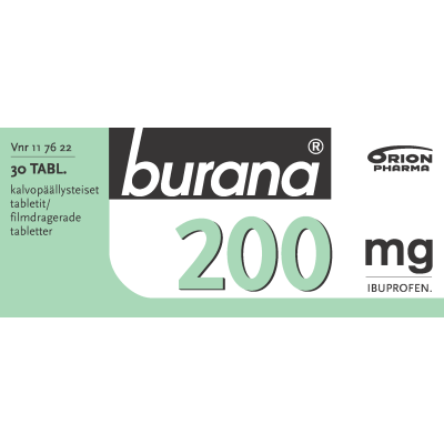 Burana 200 mg tilapäisiin kipu- ja kuumetiloihin. Vaikuttava aine ibuprofeeni. Ei tule antaa alle 10 kg lapselle.