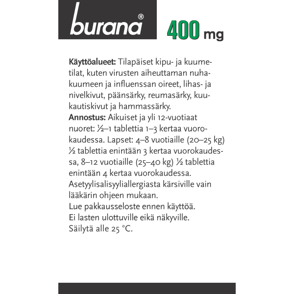 Burana on lääke tilapäiseen särkyyn, kipuun ja kuumetiloihin. Burana-tablettien sisältämä ibuprofeeni on ns. tulehduskipulääke. Se estää kivuntunteen välittymistä keskushermostoon vähentämällä tulehdusta ja kipua voimistavien välittäjäaineiden muodostumista. Se myös alentaa kuumetta vähentämällä kuumetta nostattavien välittäjäaineiden muodostumista.