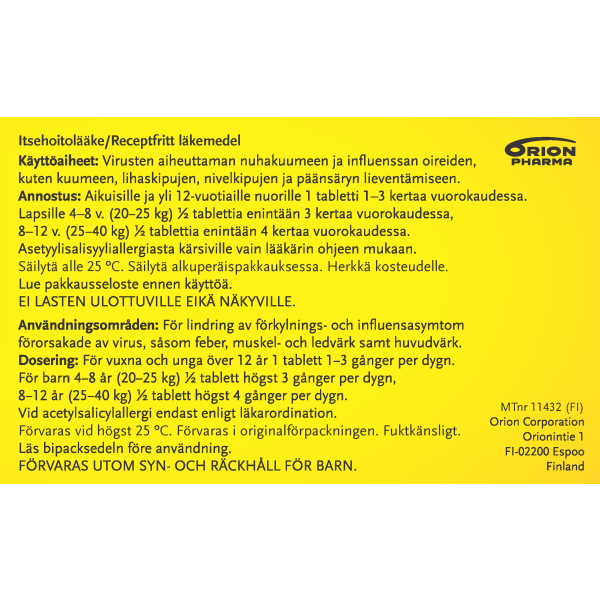 Aikuisten ja yli 12-vuotiaiden lasten tavanomainen annos on yksi tabletti 1-3 kertaa vuorokaudessa. 4-12-vuotiaiden lasten enimmäisannos on puolikas tabletti iästä ja painosta riippuen enintään 3 tai 4 kertaa vuorokaudessa. Lääke ei sovi alle 20 kg painavien lasten hoitoon. Lääkepakkauksessa on yksityiskohtaiset annostusohjeet. Samanaikaisesti ei saa käyttää muita tulehduskipulääkkeitä, sillä teho ei parane, mutta lääkkeiden haitat lisääntyvät. Vilustumislääkkeinä myytävät itsehoitovalmisteet sisältävät usein tulehduskipulääkkeitä.