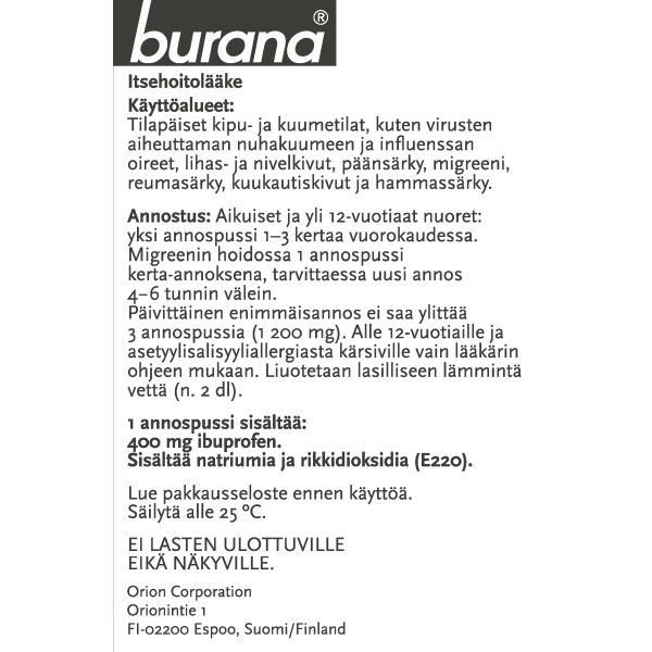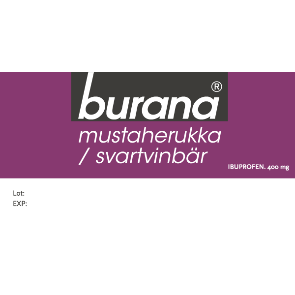 Burana mustaherukka 400 mg jauhe on lääke tilapäisiin kipu-ja kuumetiloihin, kuten virusten aiheuttama nuhakuume tai flunssan oireet. Burana mustaherukka 400 mg jauhe hoitaa myös lihas- ja nivelkipua, päänsärkyä, migreeniä, reumasärkyä, kuukautiskipua ja hammassärkyä. Vaikuttava aine ibuprofeeni. Annosjauhe sekoitetaan lasilliseen lämmintä vettä.