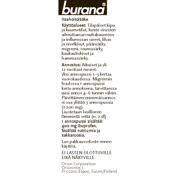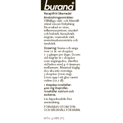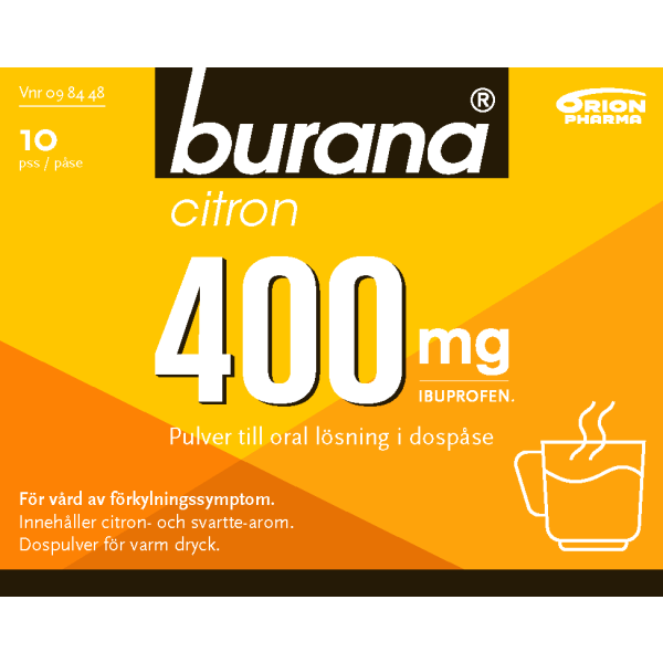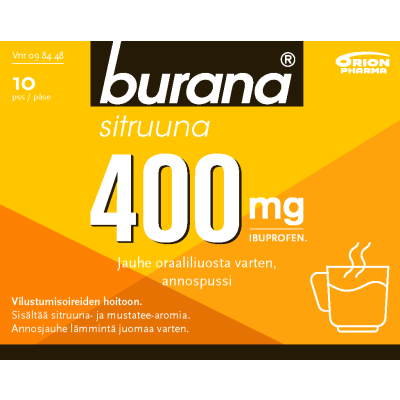 Burana sitruuna 400 mg jauhe on lääke tilapäisiin kipu-ja kuumetiloihin, kuten virusten aiheuttama nuhakuume tai flunssan oireet. Burana sitruuna 400 mg jauhe hoitaa myös lihas- ja nivelkipua, päänsärkyä, migreeniä, reumasärkyä, kuukautiskipua ja hammassärkyä. Vaikuttava aine ibuprofeeni. Annosjauhe sekoitetaan lasilliseen lämmintä vettä.