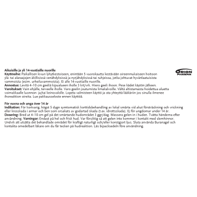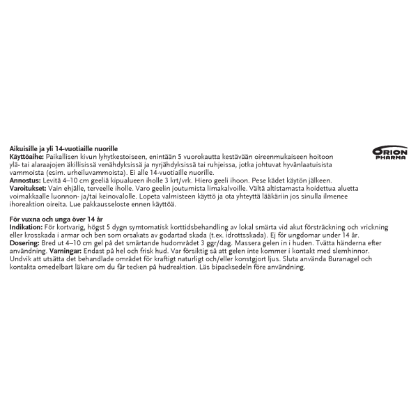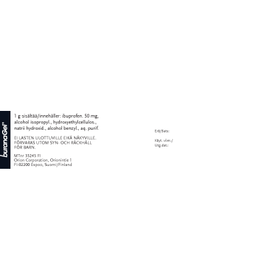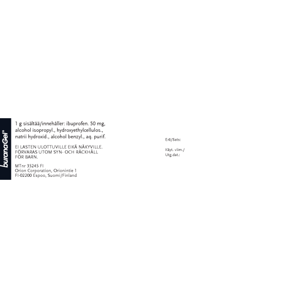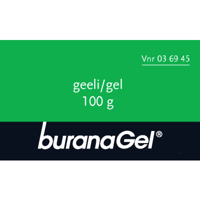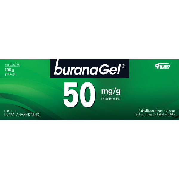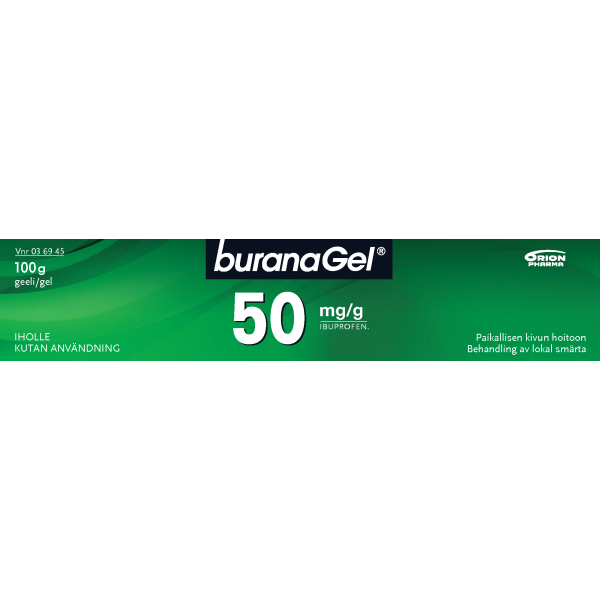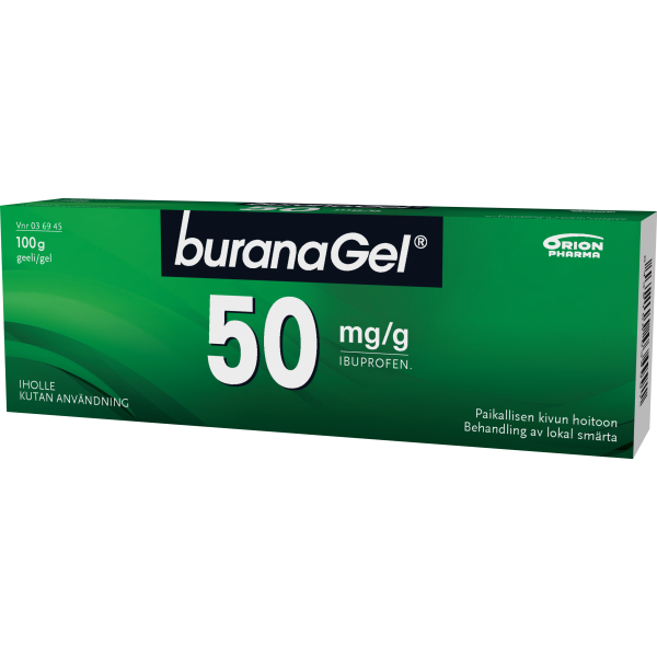 Buranagel 50 mg/g geeli paikallisen lihas-ja nivelkivun oireenmukaiseen hoitoon venähdyksissä, nyrjähdyksissä tai ruhjeissa, jotka johtuvat hyvänlaatuisista vammoista. Vaikuttava aine ibuprofeeni. Aikuisille ja yli 14-vuotiaille enintään 7 vuorokauden ajan. Ei raskauden viimeisellä kolmanneksella eikä rikkoutuneelle iholle. Varo geelin joutumista silmiin tai limakalvoille. Neuvottele käytöstä lääkärin kanssa, jos oireet pitkittyvät, jos olet yliherkkä jollekin särkylääkkeelle, sairastat maha- tai pohjukaissuolihaavaa tai sinulla on verenvuototaipumus. Tutustu huolellisesti pakkausselosteeseen. Pakkauskoot 50 g ja 100 g.