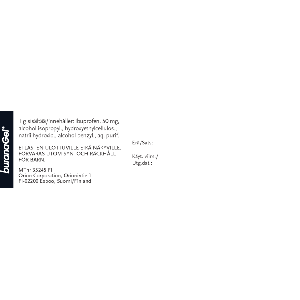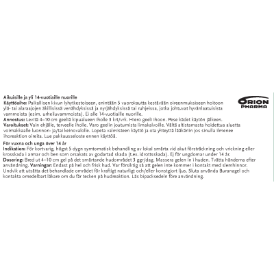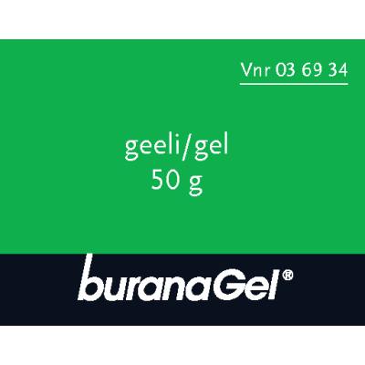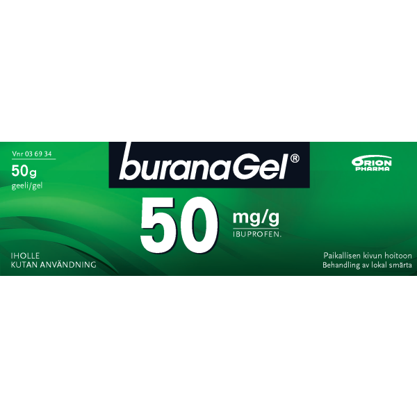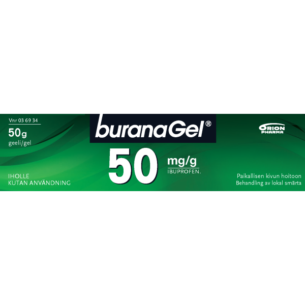 Buranagel 50 mg/g geeli paikallisen lihas-ja nivelkivun oireenmukaiseen hoitoon venähdyksissä, nyrjähdyksissä tai ruhjeissa, jotka johtuvat hyvänlaatuisista vammoista. Vaikuttava aine ibuprofeeni. Aikuisille ja yli 14-vuotiaille enintään 7 vuorokauden ajan. Ei raskauden viimeisellä kolmanneksella eikä rikkoutuneelle iholle. Varo geelin joutumista silmiin tai limakalvoille. Neuvottele käytöstä lääkärin kanssa, jos oireet pitkittyvät, jos olet yliherkkä jollekin särkylääkkeelle, sairastat maha- tai pohjukaissuolihaavaa tai sinulla on verenvuototaipumus. Tutustu huolellisesti pakkausselosteeseen. Pakkauskoot 50 g ja 100 g.