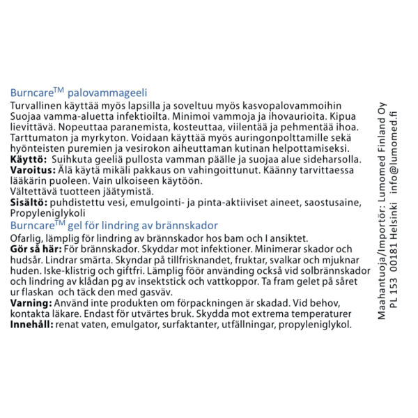 Palovammageeliä voi käyttää myös auringonpolttamien, hyönteisten puremien ja vesirokon aiheuttaman kutinan helpottamiseksi. Turvallinen käyttää myös lapsille ja kasvopalovammoille.