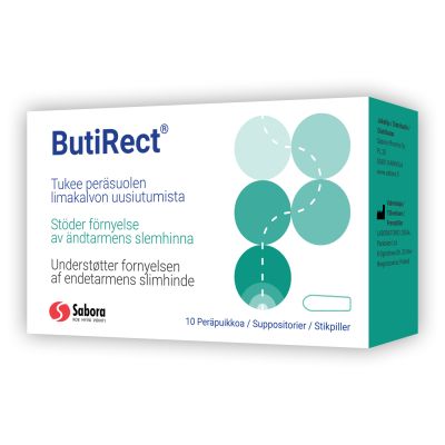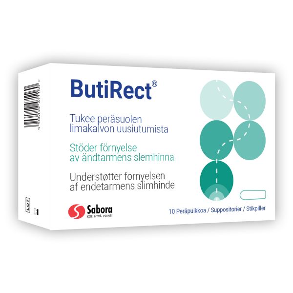 ButiRect peräpuikko hoitaa ja suojaa peräsuolen limakalvoa, lievittää ulostamiseen liittyvää kipua sekä edistää limakalvon uusiutumista. Sopii aikuisille.