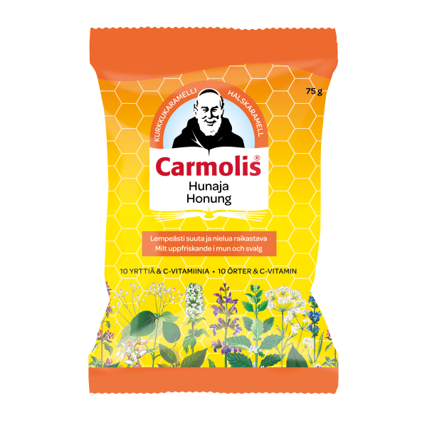 Carmolis Hunajainen Yrttikaramelli sisältää yrttien eteeristen öljyjen seosta. Carmolis Hunajaisessa yrttikaramellissa on lempeästi raikastava, mieto hunajainen maku. Karamelli sisältää myös C-vitamiinia, mutta ei keinotekoisia makeutusaineita.