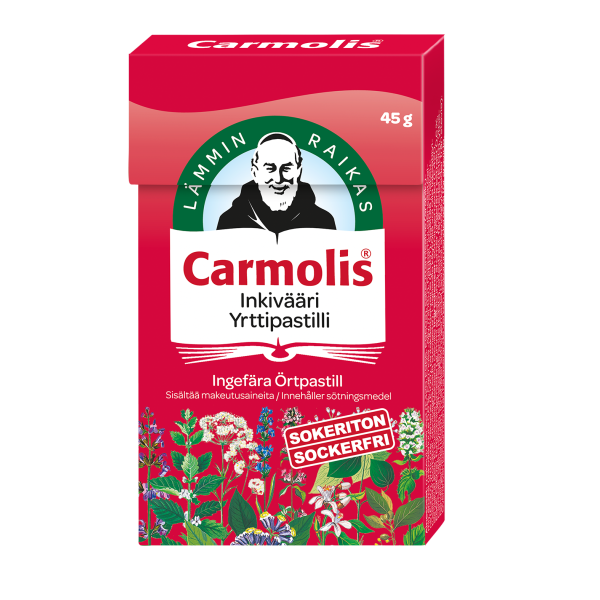 Sokeriton Carmolis Inkivääri Yrttipastilli lämmittää suuta. Pehmeää pastillia on helppo imeskellä suussa
