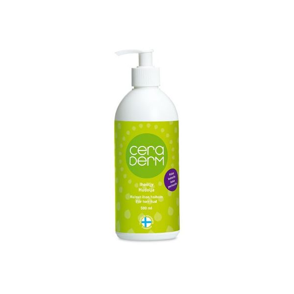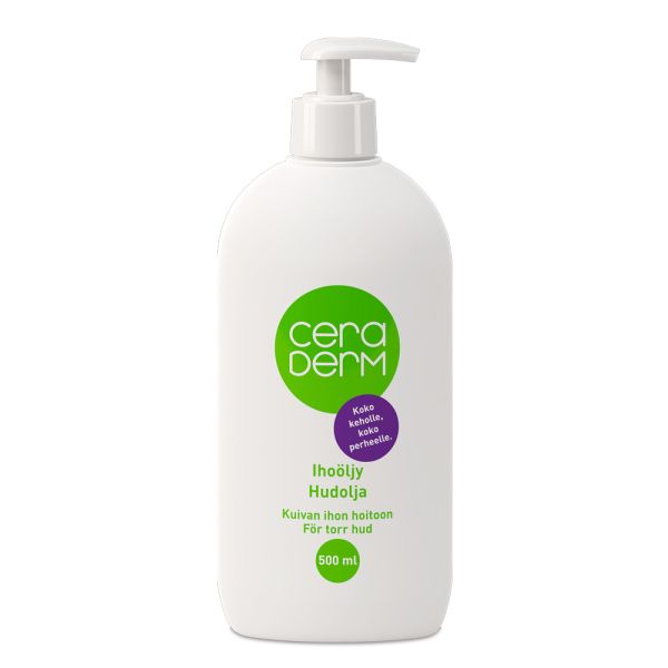 Ceraderm Ihoöljy ylläpitää ihon luonnollista kosteustasapainoa vahvistamalla ihon omaa suojaa ja ehkäisemällä kosteuden liiallista haihtumista. Ei sisällä vettä, hajusteita, emulgaattoreita, säilöntä- tai väriaineita.