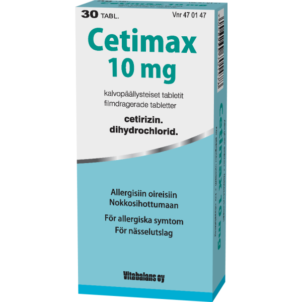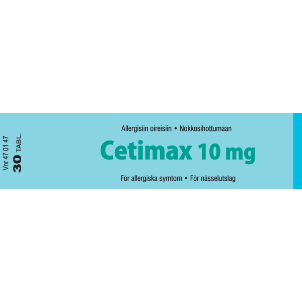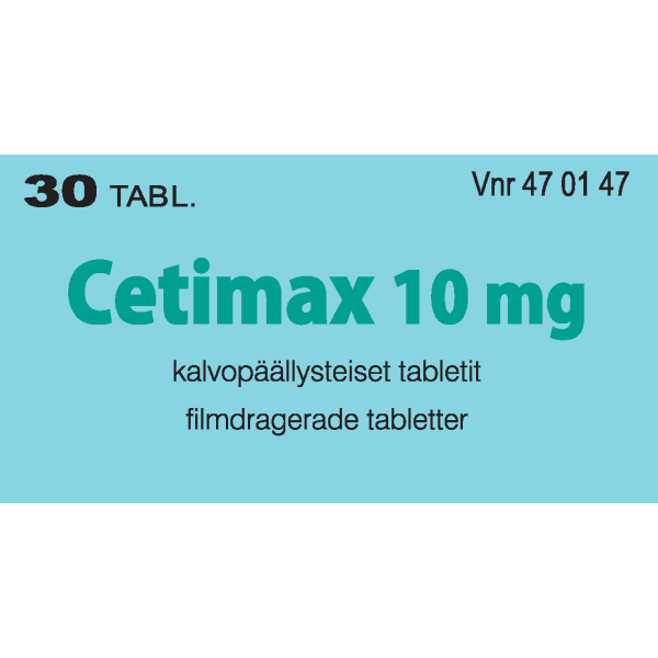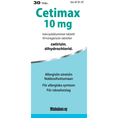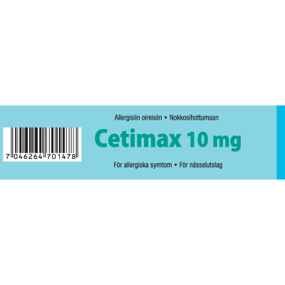 Cetimaxin vaikuttava aine on setiritsiini. Setiritsiini on antihistamiini, jota käytetään allergian (yliherkkyyden) hoitoon. Cetimax on tarkoitettu aikuisten ja vähintään 6-vuotiaiden lasten kausiluonteiseen ja ympärivuotiseen allergiseen nuhaan liittyvien nenä- ja silmäoireiden hoitoon ja pitkäaikaisen nokkosihottuman (kroonisen idiopaattisen urtikarian) hoitoon.