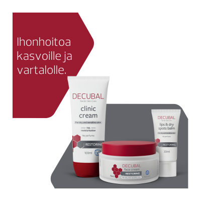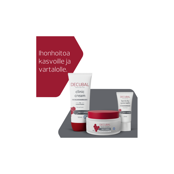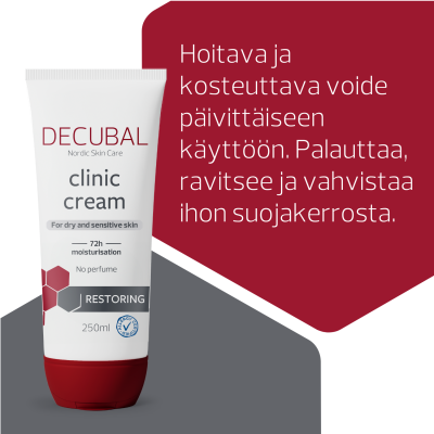 Decubal Clinic on alkuperäinen, klassinen Decubal -voide, joka kosteuttaa, suojaa ja pehmentää kuivaa ihoa. Ainoa perusvoide, jonka voidepohjana on erikoispuhdistettu lanoliini. Kuivan ja vaativan ihon päivittäiseen hoitoon koko keholle Käsivoiteeksi ja kynsinauhojen hoitoon Jalkavoiteeksi, pikkulapsille vaippa-alueen ihon hoitoon Naisille raskausarpien ehkäisyyn ja imetysaikana rintojen hoitoon Ikääntyville ihon kosteustasapainon ylläpitoon. Psoriaatikoille valohoidon ja steroidihoidon yhteydessä Atooppiselle iholle, ihottumien ja psoriasiksen perushoitoon.
