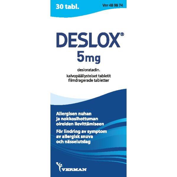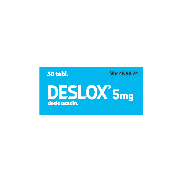 Deslox on allergialääke, joka sisältää antihistamiini desloratadiinia. Deslox auttaa hillitsemään allergisia reaktioita ja niiden oireita aikuisilla ja vähintään 12-vuotiailla nuorilla. Yli 30 tabletin pakkauskoot on tarkoitettu vain lääkärin aiemmin toteamien allergisten oireiden hoitoon. Pitkäaikaiseen käyttöön ja alle 12-vuotiaille lapsille vain lääkärin ohjeen mukaan.