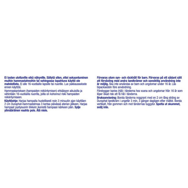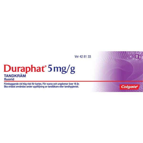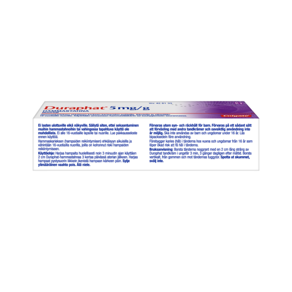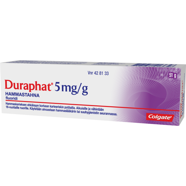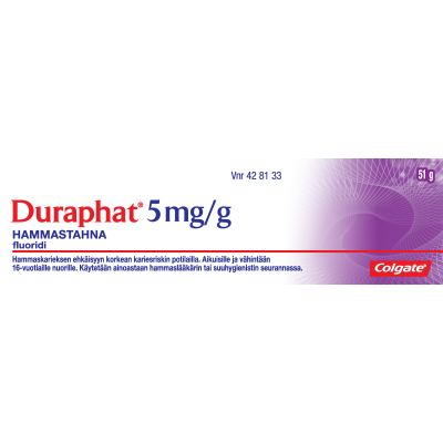 Duraphat® 5 mg/g hammastahna on lääke, jonka fluoripitoisuus on korkea. Suuri fluoripitoisuus pysäyttää ja palauttaa ennalleen alkavia reikiä hampaissa.