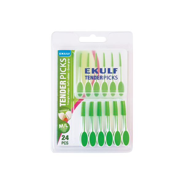 Ekulf TenderPicks on tavallisen hammastikun ja hammasväliharjan välimuoto. Pehmeä ja hellävarainen hammasvälien puhdistamiseen. Sisältää matkarasian kuudelle tikulle.