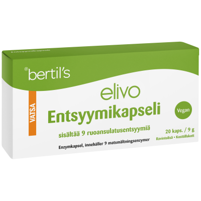 Elivo Entsyymikapseli sisältää yhdeksän eri ruuansulatusentsyymiä tukemaan ruuansulatusta. Entsyymit pilkkovat ravinnon proteiineja, rasvaa ja hiilihydraatteja imeytyvään muotoon. Entsyymit ovat mikrobiperäisiä ja kapselin kuori on kasviperäinen, joten kapselit eivät sisällä eläinperäisiä ainesosia.