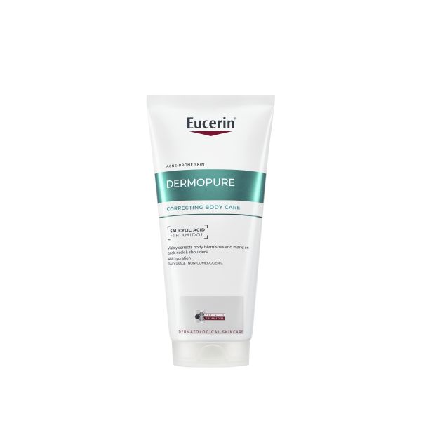Eucerin DermoPure Correcting Body Care -vartalovoide korjaa tehokkaasti selän, niskan ja hartioiden ihon epäpuhtauksia ja epätasaisuuksia. Se sisältää salisyylihappoa (BHA), patentoitua Thiamidolia ja skvaleenia, jotka yhdessä puhdistavat, korjaavat ja tasoittavat tummia läiskiä ja epätasaisuuksia. Voide kosteuttaa ihoa 48 tunnin ajan. Se sopii 12-vuotiaille ja sitä vanhemmille sekä kaikille ihotyypeille.