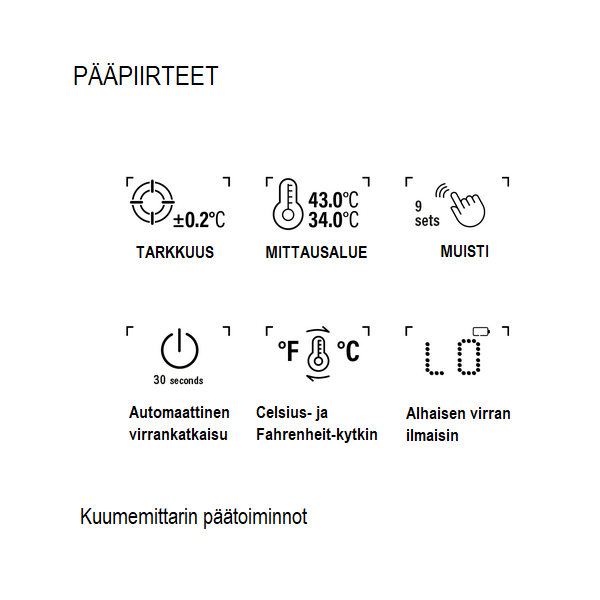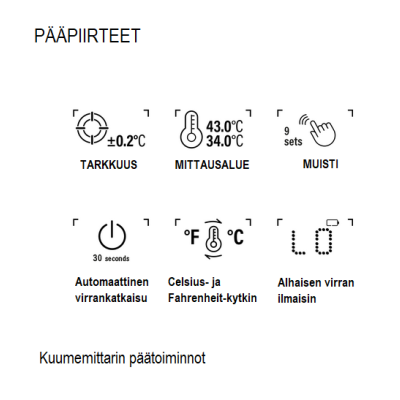 Infraröd termometer, förvaringsväska, bruksanvisning på finska och svenska, två 1,5 V batterier AAA (vi rekommenderar att du använder alkaliska batterier).