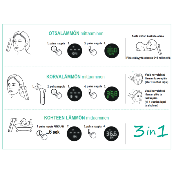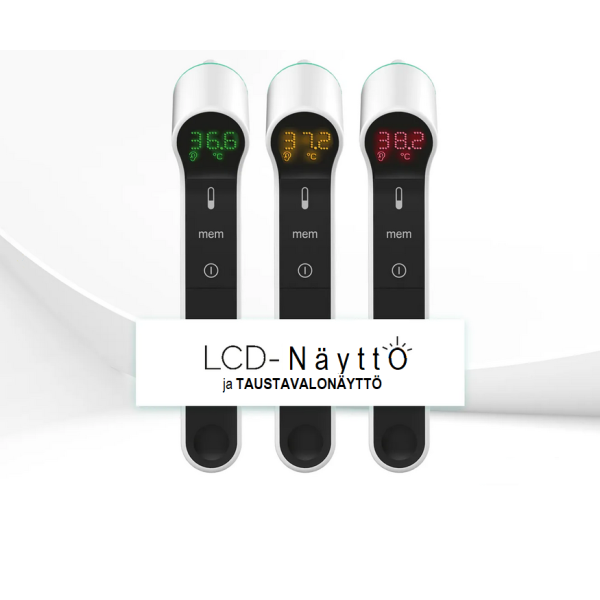 Lämpötila näkyy selkeästi LCD-näytöllä myös mitattaessa pimeässä. Lämpötila näytetään eri värillä (vihreä, oranssi, punainen) riippuen siitä, onko henkilöllä normaali lämpö, lievästi lämpöä tai kuumetta. Lämpötila-asteikon voi vaihtaa Celsiuksen ja Fahrenheitin välillä. Mittaustulos tulee noin yhdessä sekunnissa.