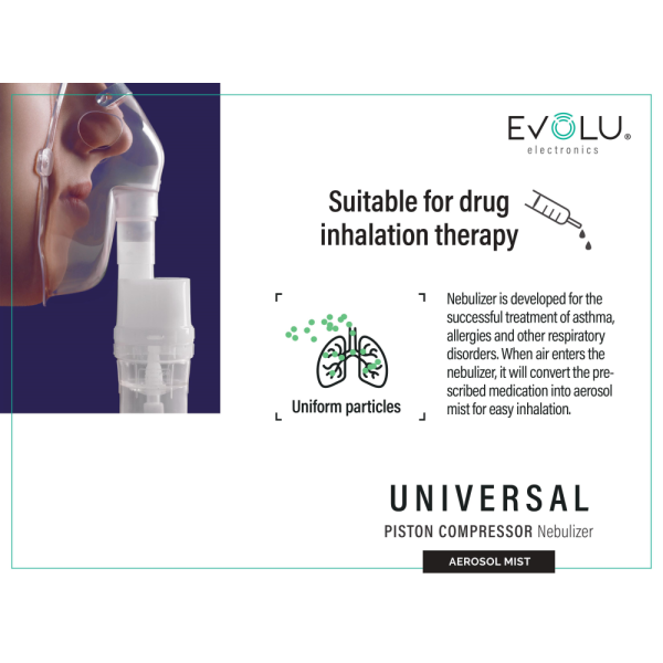 EVOLU Universal nebulisaattori mäntäkompressorilla on tarkoitettu sumutinsuspensioiden ja sumutinliuosten nebulisointiin kotikäytössä ja hoivayksiköissä. Sopii kaikenikäisille. Helppokäyttöinen. EVOLU Universal nebulisaattori muodostaa nebulisoitavasta lääkkeestä hyvin hienojakoista lääkesumua (hiukkaskoko 0,5 – 6 mikronia, MMAD 2,44 mikronia), jonka potilas inhaloi keuhkoihinsa.