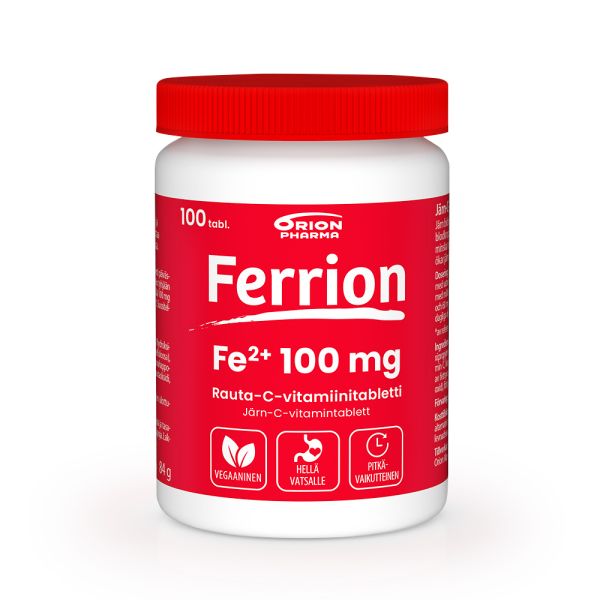 Ferrion 100 mg on vahva, pitkävaikutteinen rauta -ja C-vitamiinivalmiste, jossa rauta on vatsaystävällisessä bisglysinaattimuodossa. Ferrion sisältää 100mg rautaa ja 60 mg raudan imeytymistä tehostavaa C-vitamiinia. Pitkävaikutteisesta tabletista rauta vapautuu vasta ohutsuolessa, mistä se parhaiten imeytyy elimistön käyttöön. Valmisteen voi halutessaan nauttia myös ruokailun yhteydessä*, mikä voi auttaa vähentämään mahdollista vatsaärsytystä. Pienikokoisen, helposti nieltävän tabletin voi tarvittaessa puolittaa. Sopii myös vegaaneille. Ravintolisä.